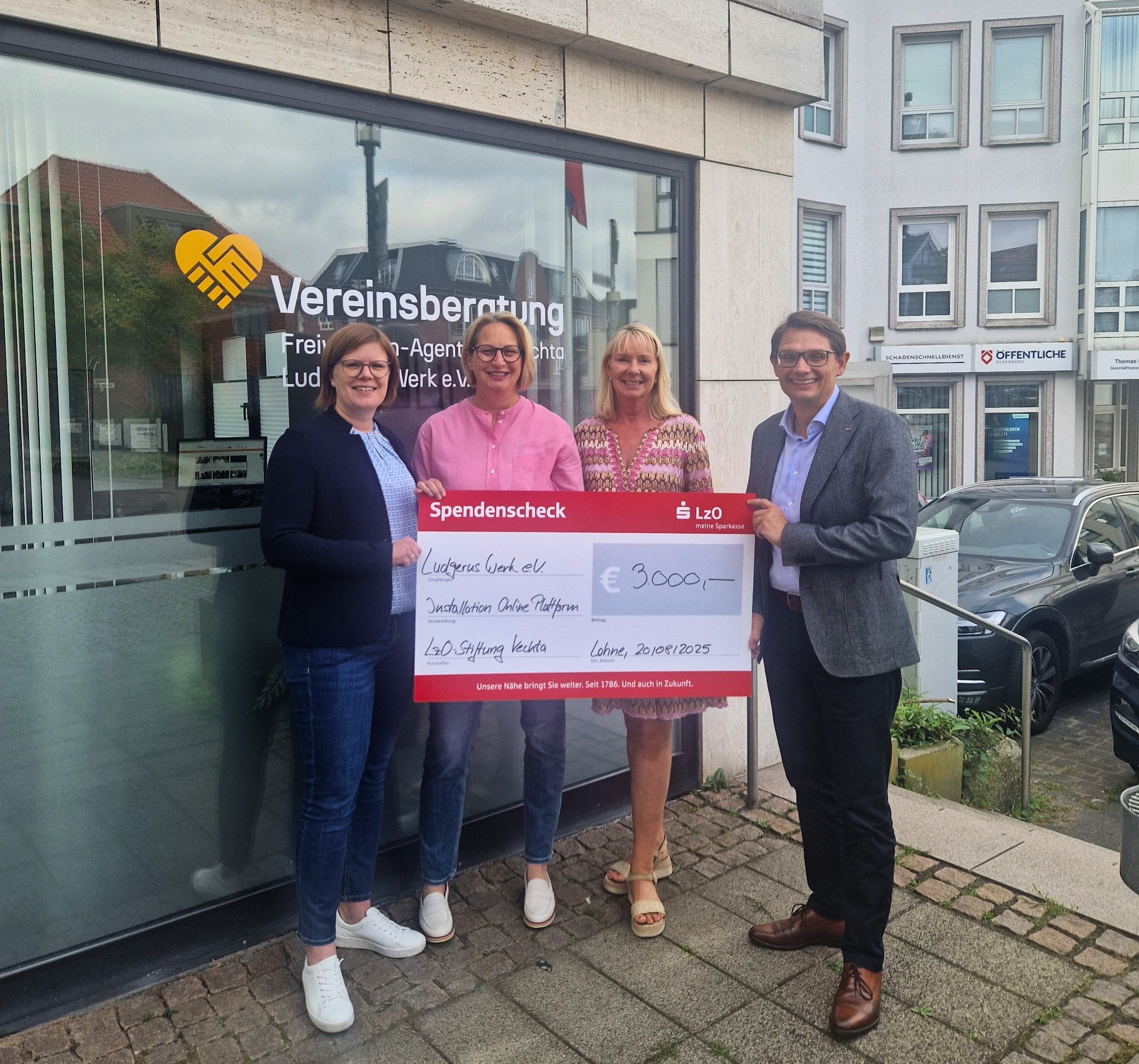 Den symbolischen Scheck überreichte Thomas Baumann, Regionaldirektor der LzO Vechta und stellvertretender Vorsitzender der Stiftung, an Indra Möller von der Freiwilligen-Agentur Herz & Hand sowie an Annette Kröger (Vorstand und Gesamtleitung) und Britta von Lehmden (Leitung Familienbildungsstätte) vom Ludgerus-Werk e.V. Lohne.