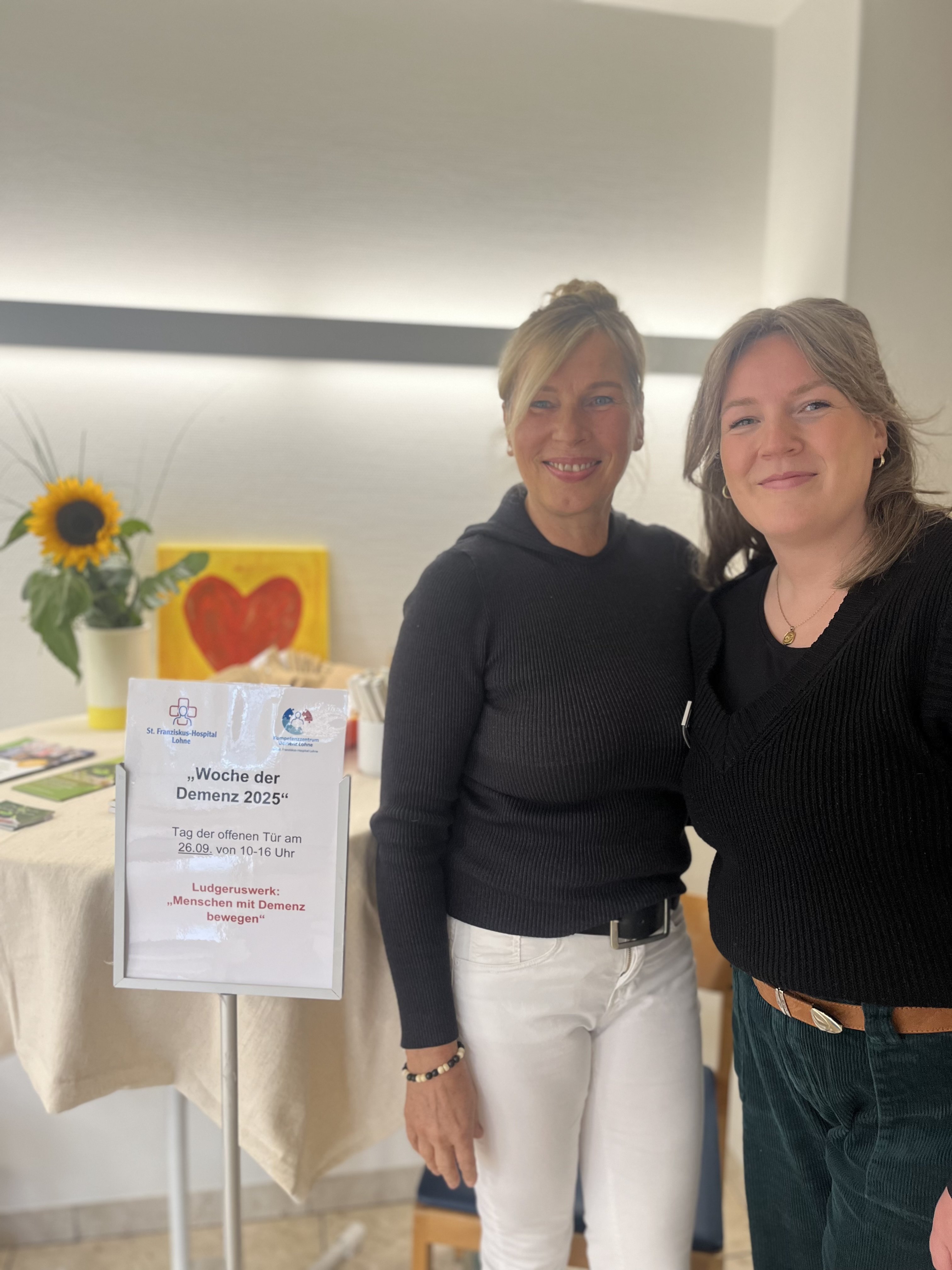 Am Freitag, 26. September, war das Ludgerus-Werk im Rahmen der Woche der Demenz an einem Stand im St. Franziskus-Hospital in Lohne vertreten. Gemeinsam haben unsere pädagogische Mitarbeiterin Sabrina Diekhaus und Dozentin Marika Görtz-Ochotzki den Kurs „Menschen mit Demenz bewegen“ vorgestellt, beworben und auf die Vorteile von Bewegung bei Menschen mit Demenz aufmerksam gemacht. Seit einiger Zeit findet der Kurs regelmäßig unter Götz-Ochotzkis Leitung im Ludgerus-Werk statt. Als Neuerung gibt es nun auch eine Gesprächsrunde für Angehörige der Kurs-Teilnehmenden während der Bewegungskurs stattfindet, um sich über die Herausforderungen bei Kaffee und Kuchen auszutauschen.